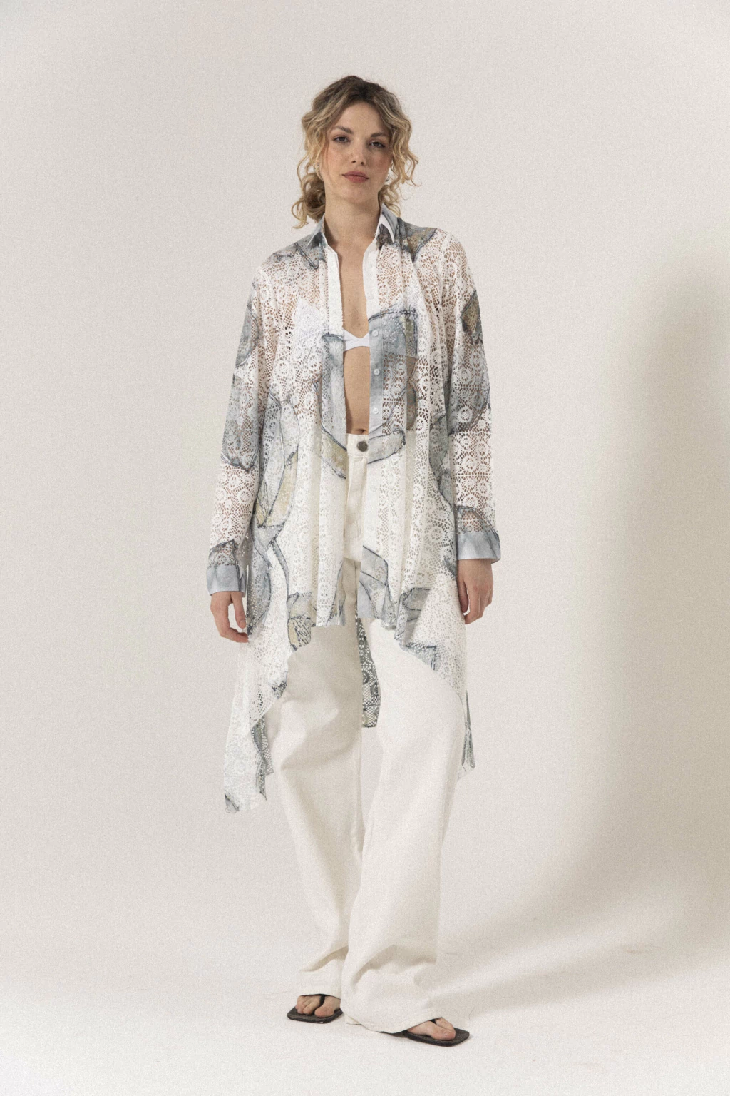 Una prenda con alma propia. Nuestra Camisa Encaje Tulip está estampada de forma totalmente artesanal, una por una, haciendo que cada pieza sea única. Confeccionada en knitting net, un tejido liviano y su silueta amplia la convierten en una opción versátil, ideal para usar suelta o con cinturón.