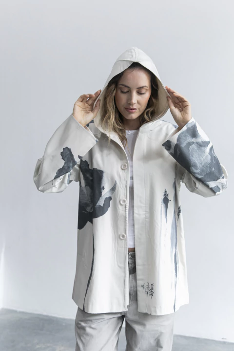 Nuestra campera Lirio es mucho más que una prenda impermeable: es una pieza única, confeccionada y estampada de forma artesanal con un diseño exclusivo de hojas en tonos azules. Su interior forrado en polar la convierte en una aliada perfecta para los días más fríos y lluviosos, brindándote abrigo y protección sin dejar de lado el estilo.