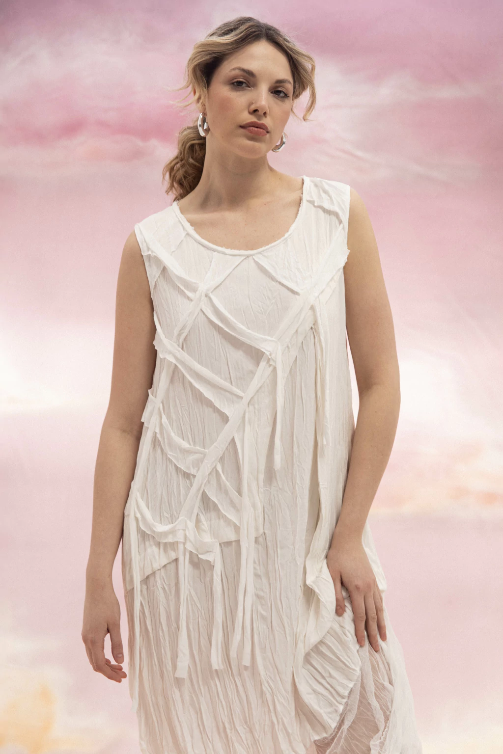 Confeccionado en gasa de algodón y fabricado en Italia exclusivamente para Coco Mui, el vestido Sicilia es la definición de frescura y estilo. Su diseño presenta detalles en el frente y terminaciones irregulares en la parte superior, que aportan un toque distintivo y natural.
